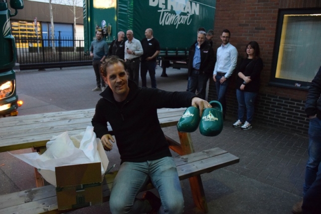 Op de foto's achtereenvolgens: 1. Jan en Lia Hols. 2. Jan en Lia met de beide zonen. 3. Arjan van Dijk en Gert Groeneveld, beiden van Bakker Bedrijfswagens, overhandigen de sleutel aan Jan. 4. Jan met de voltallige directie van het mooiste transportbedrijf van Nijkerk. 5. Jan met Herman, de monteur van Bakker Bedrijfswagens die een groot deel van de opbouw voor zijn rekening heeft genomen. 6. Graddus de Haan Jr. met de klompen die hij cadeau kreeg, even later overigens nog gevolgd door een paar schoenen in kleur......