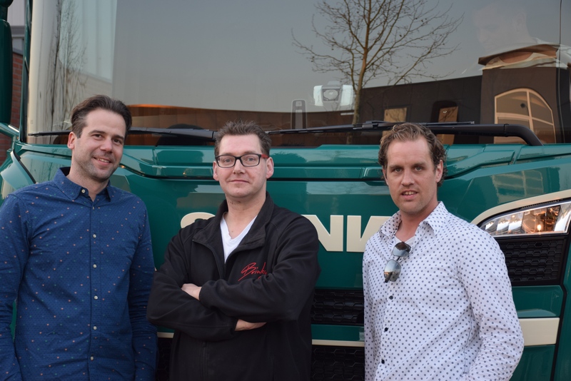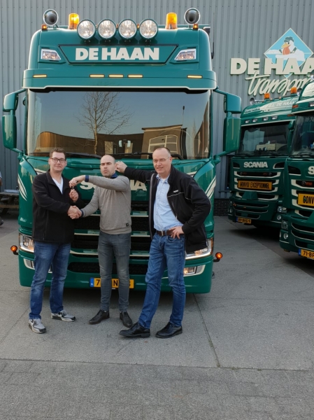 Op foto1 ziet u chauffeur Wim van den Brink die de sleutels in ontvangst neemt van Martin Besselsen van Scania, Willem Lanser van Scania kijkt toe.