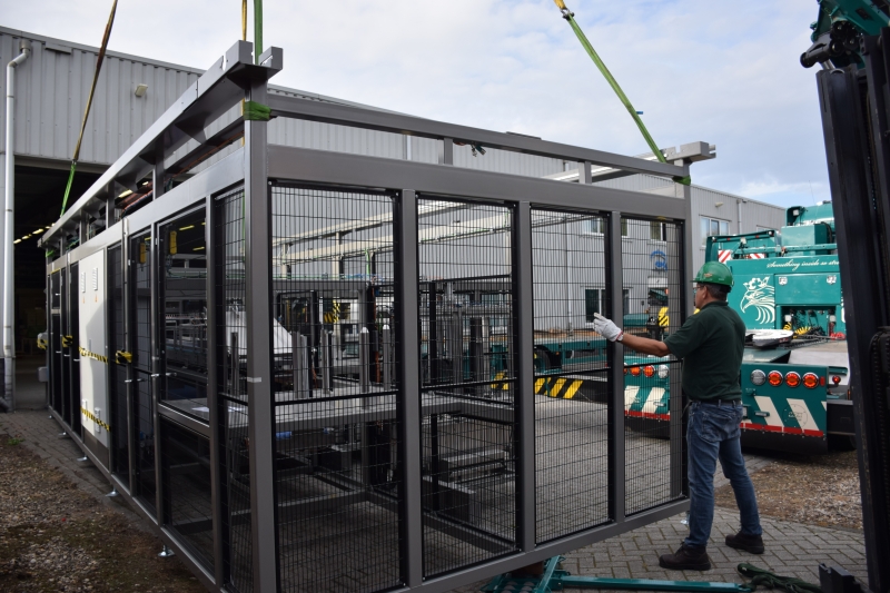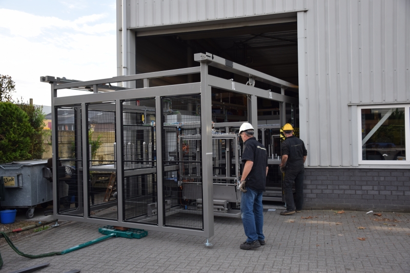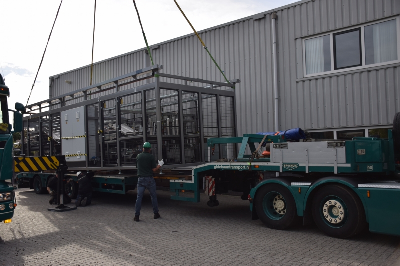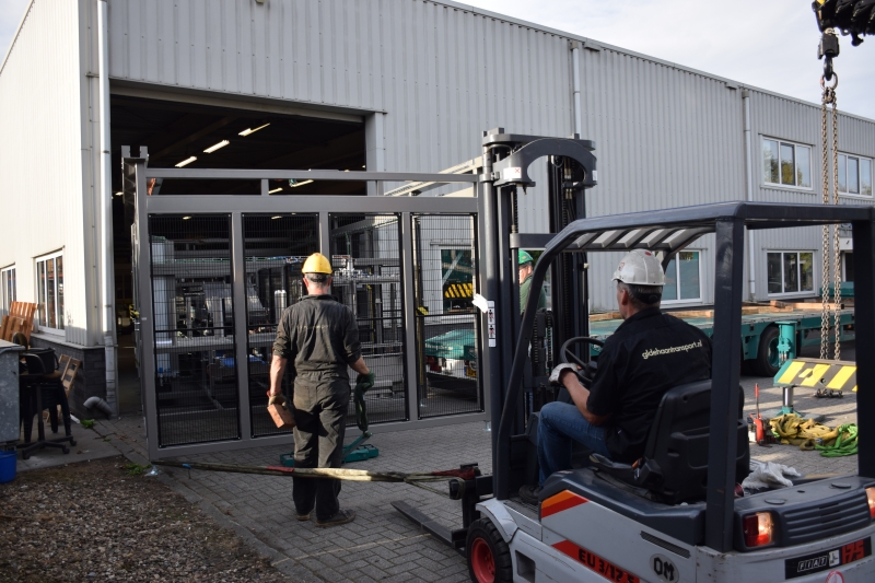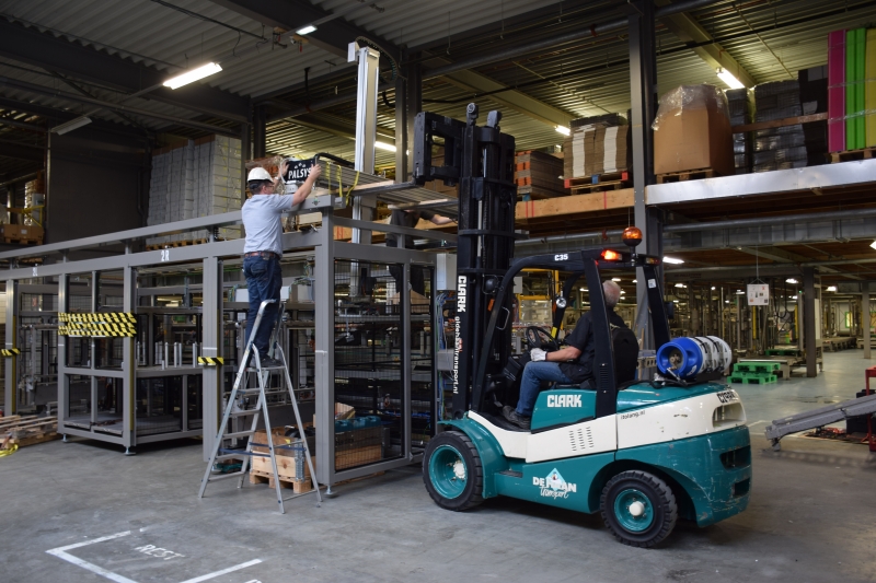 Het grootste deel van het palletiseersysteem heeft een omvang van (LxBxH) 10x3,5x3m en weegt ± 5 ton. Met behulp van intern transportmaterieel wordt begonnen met dit deel naar buiten te rijden.....