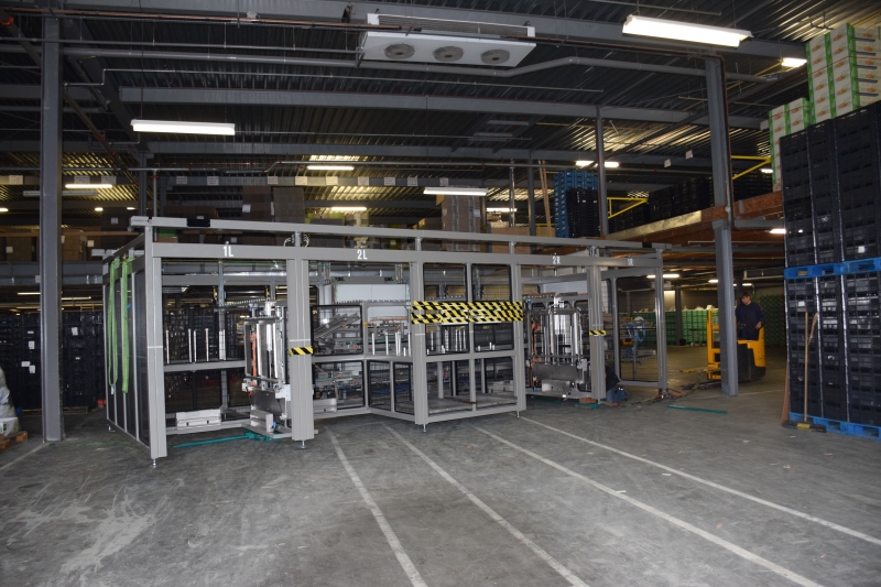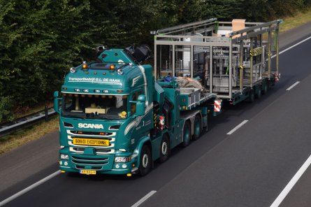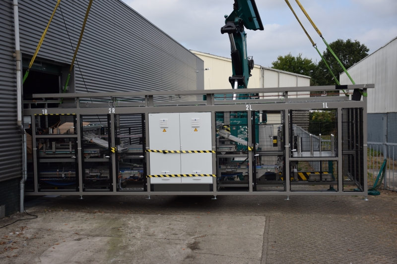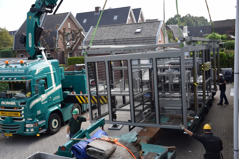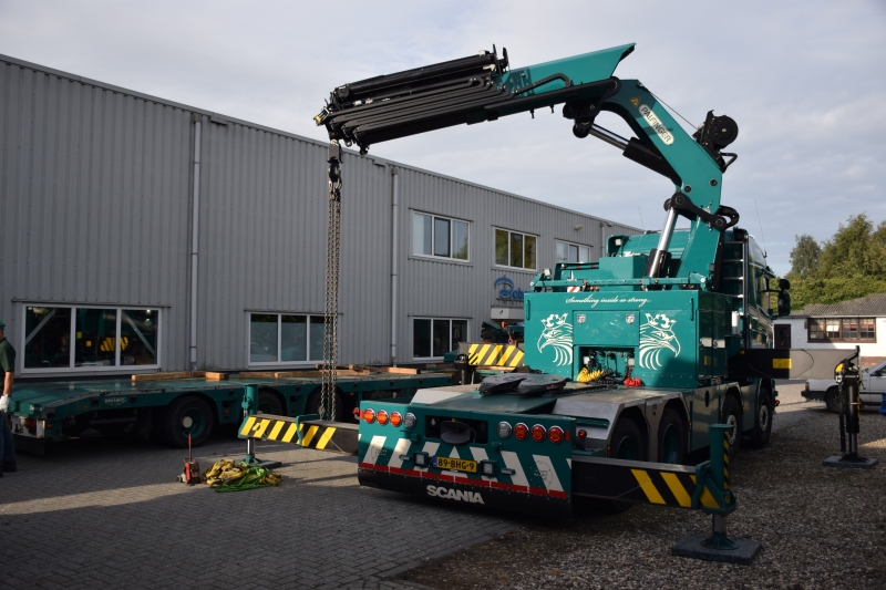 In opdracht van Roboxis Packaging BV te Barneveld werd op zaterdag 1 oktober een gloednieuw palletiseersysteem getransporteerd naar de afnemer van de machine in het oosten van het land. De machinelijn kan geheel automatisch doosjes die gevuld zijn met een bepaald produkt in een grote doos of krat stapelen. Daarbij kan de machine die dozen of kratten geheel automatisch op pallets stapelen. Al met al waren 2 huifgesloten opleggers, een semidieplader met 110 tonmeter kraan en een bakwagen nodig om de complete machinelijn te vervoeren. Teneinde bij de afnemer zoveel mogelijk stilstand te voorkomen werden deze transporten op zaterdag gepland. De tot dan gebruikte lijn werd mee retour genomen.